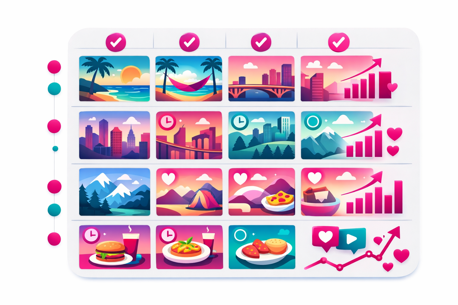 Content pillars are 3–5 recurring themes that make up your content mix. They give your account variety while keeping everything connected to your niche. Pillars also make it dramatically easier to come up with travel content ideas because you're never starting from scratch.